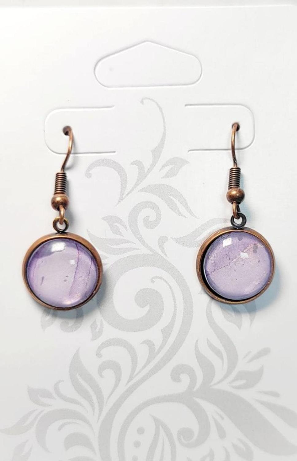 Hand crafted artisan dangle drop earrings with a light purple and gold marble effect, set in a copper colored earring bezel tray. Measures 1".
