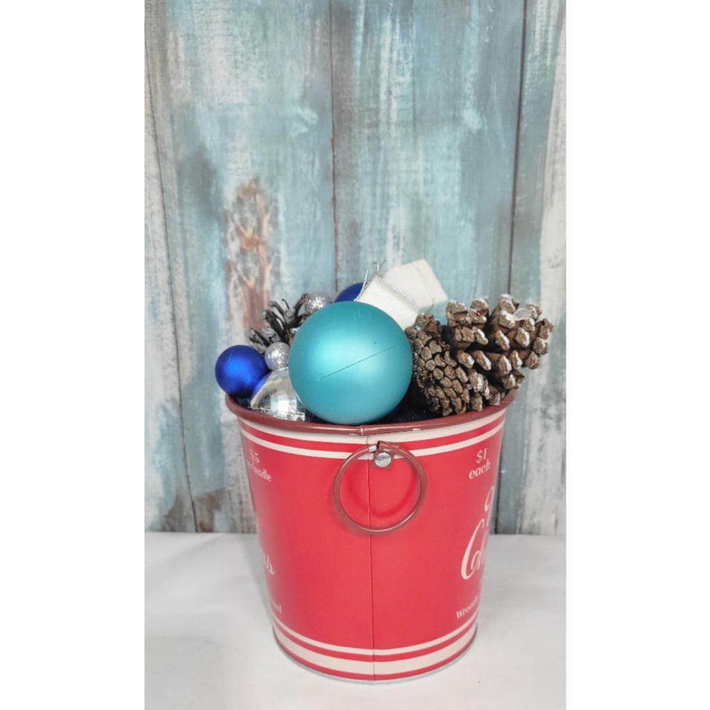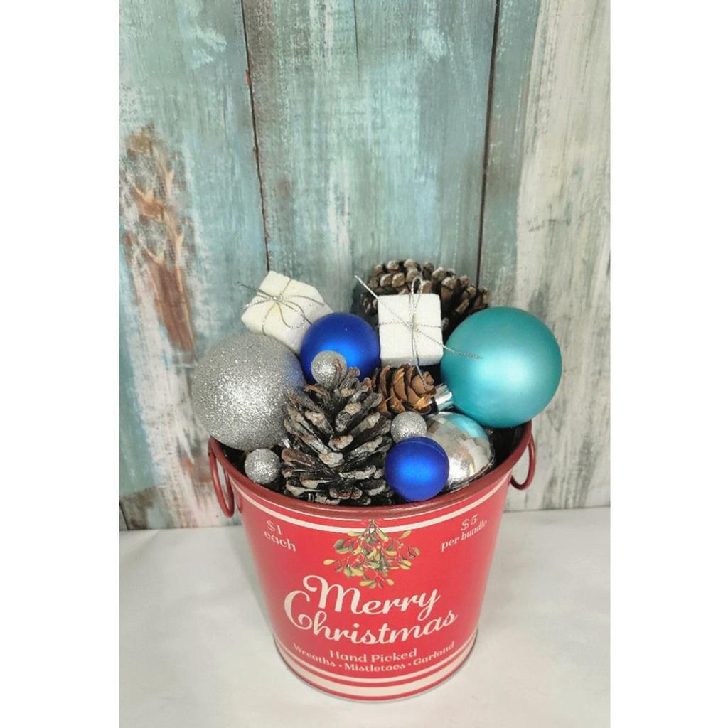 This is a new, unused Ashland Christmas decorative container. It is a red metal bucket with a white rim. The bucket is approximately 6 inches tall and 5 inches in diameter. It features a printed design that says "Merry Christmas" and "Hand Picked Wreaths - Mistletoes - Garland." The bucket is handcrafted with various blue and silver shatterproof Christmas ornaments and white presents, as well as pine cones. The bucket is in perfect condition and comes with its original tags. It would make a perfect table centerpiece during the holiday season