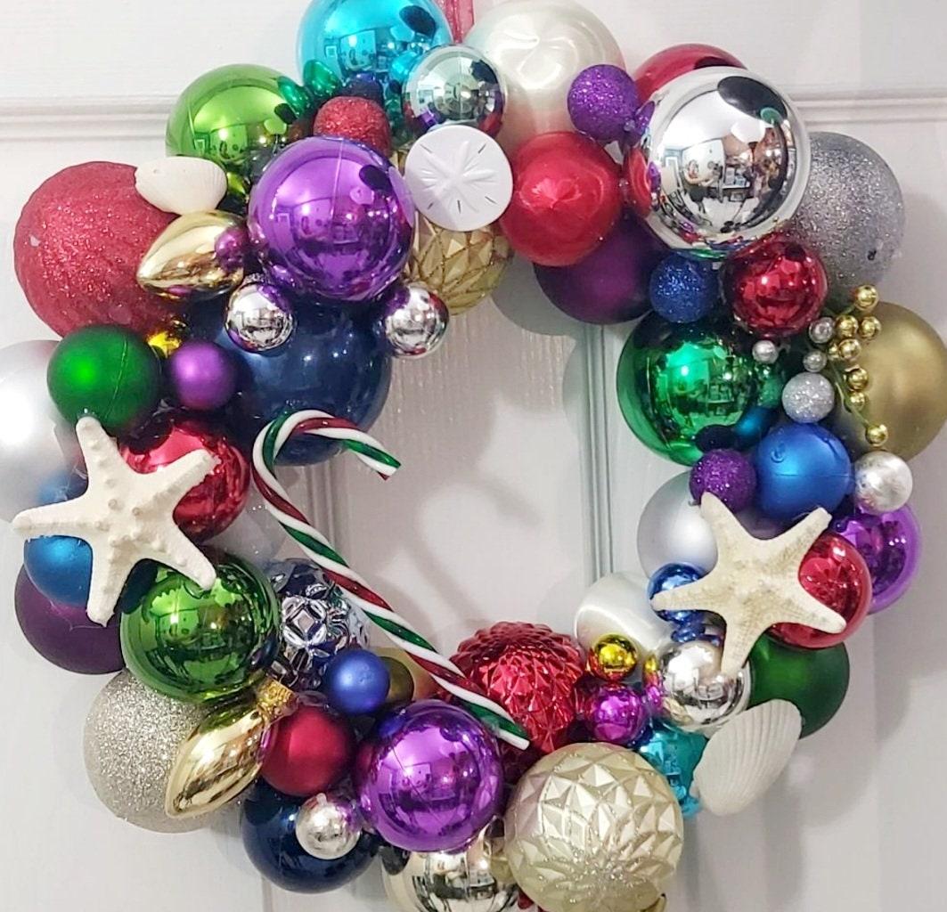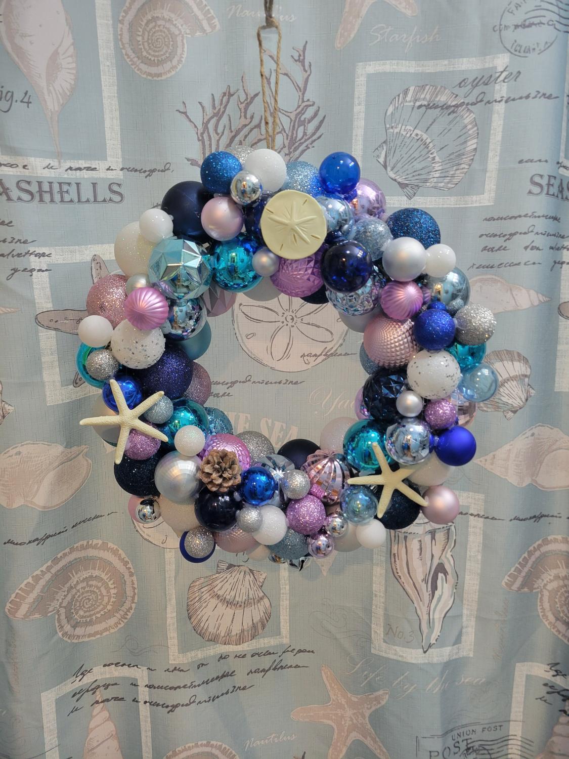 Beach Coastal Christmas Winter wreath with shatterproof ball ornaments Nautical beach theme