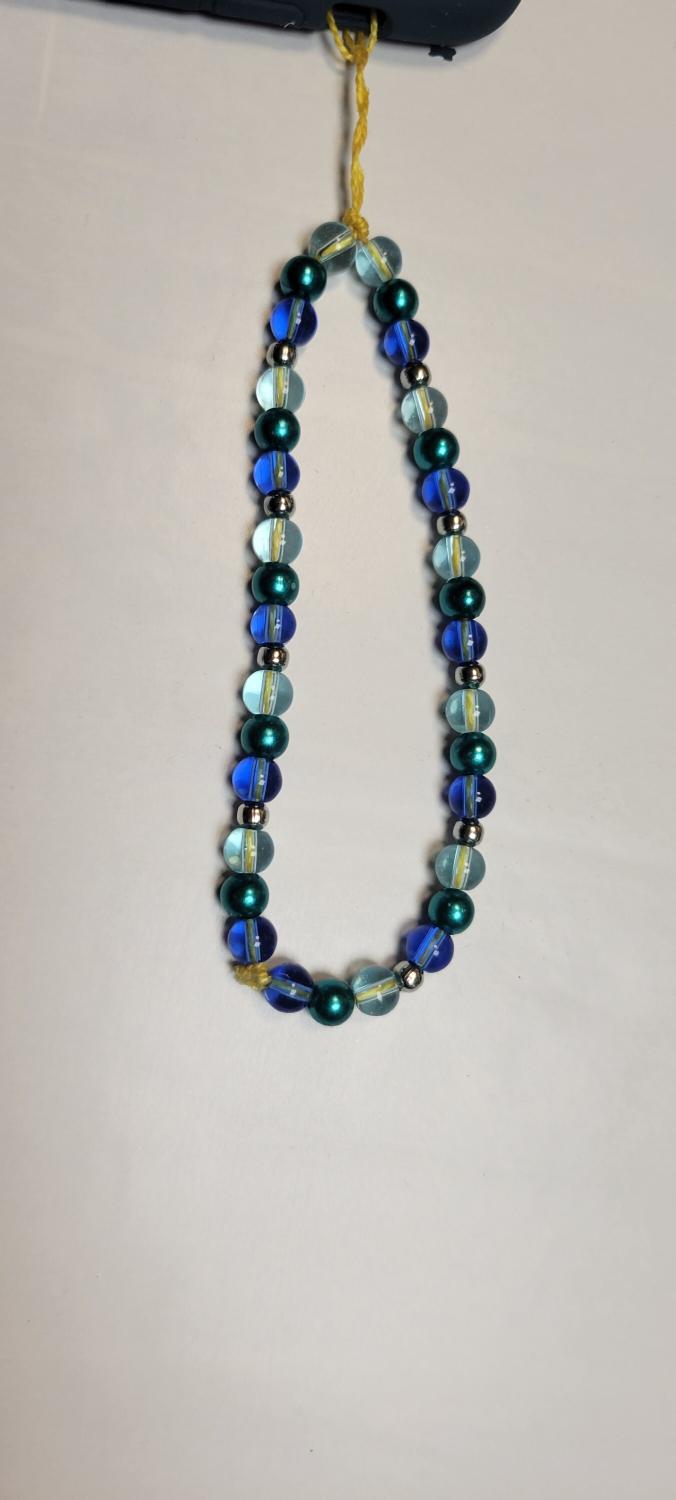 Handmade shades of blues glass bead and silver spacers cellphone accessory charm wristlet strap. Loop the thin cord through the volume or microphone holes on your cellphone and use the strap to hold onto your phone more securely by wearing it around your wrist. Loop measures approximately 7". This cellphone charm wristlet strap makes an ideal gift for anyone in your life that loves to add a little color to their life. Item may be personalized with a first name, available in white with gold lettering square plastic beads, longer lengths available upon request. All purchases are wrapped with care and a handwritten thank you card included. Gift wrapping is available upon request.