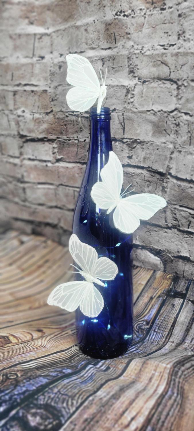 A gorgeous cobalt blue wine bottle repurposed into a table centerpiece for home, a wedding table, or as simple as your night stand or end table. 3 white butterfly appliques have been added, along with a string of LED fairy lights, which the box is conveniently velcroed onto the back, making it easy to turn on and off, and replace the 2x AA batteries when needed. I'm able to gift wrap this and include a gift receipt prior to shipping, please just message me if you need this done.