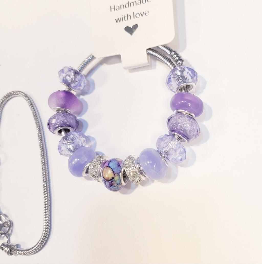 Handmade beaded 7" adjustable snake coil bracelet. The beads are made from brass, resin, and glass. The bracelet also comes with a second snake coil chain, with a 2" adjustable clasp and a heart charm. Simply twist the end off to customize your bracelet at home. This elegant charm bracelet features a stunning combination of purple hues, perfect for adding a touch of sophistication to any outfit. The intricate design and vibrant colors make it a must-have accessory. #Europeanstylebeads #beadedbracelet #snakecoilbracelets