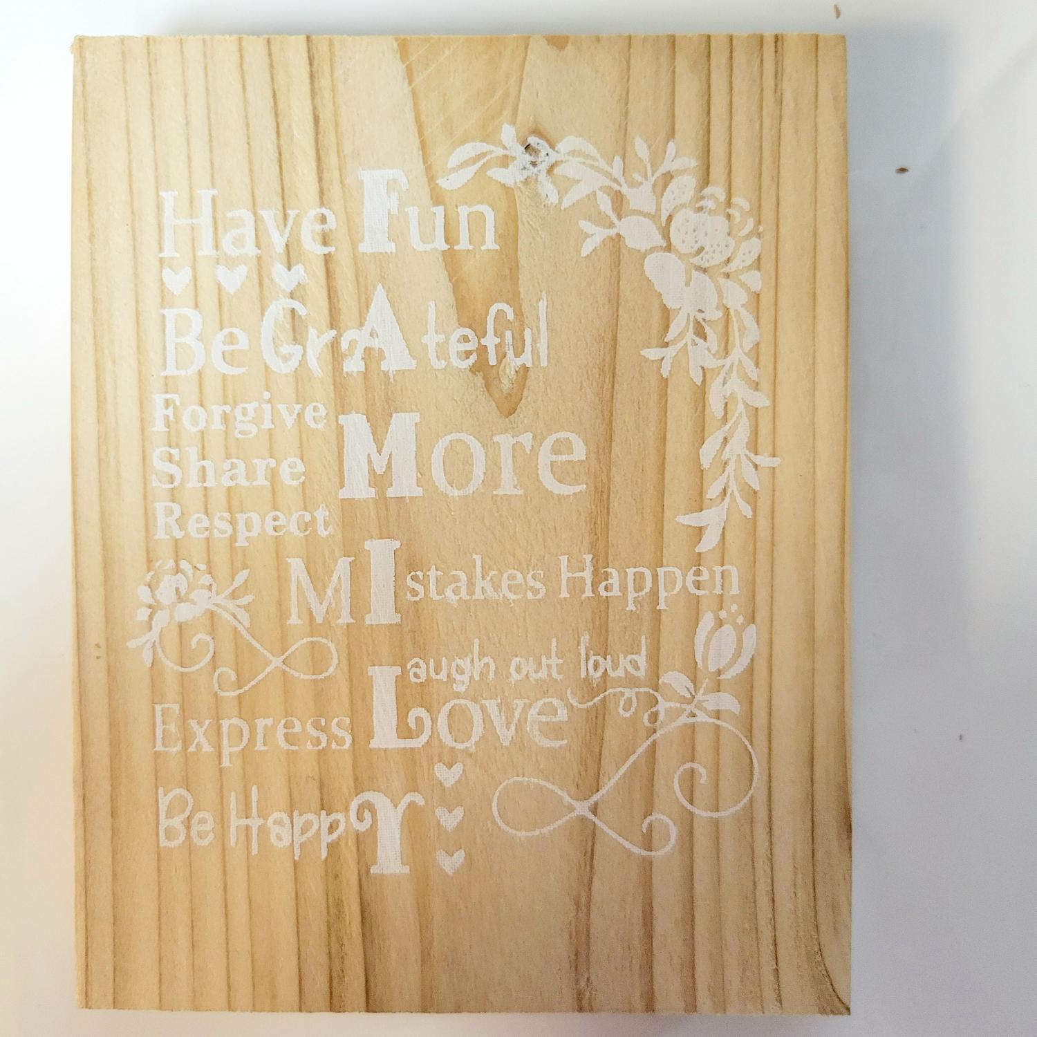 Handpainted on cedar, measuring approximately 4x3", a Family acrostic sign, Have Fun. Be grAteful, forgive share respect More, mIstakes happen, express Love/ Laugh out loud, be happY, table art, wall hanging, Inspirational quote, rustic, Farmhouse decor. A twine can be added prior to shipping to hang from. All orders are wrapped with care and a handwritten thank you card included. Gift wrapping is available upon request.