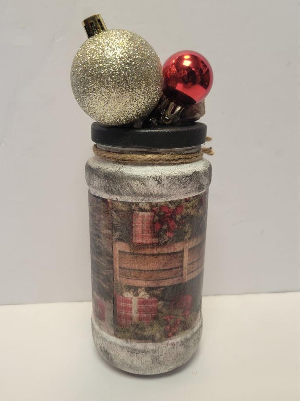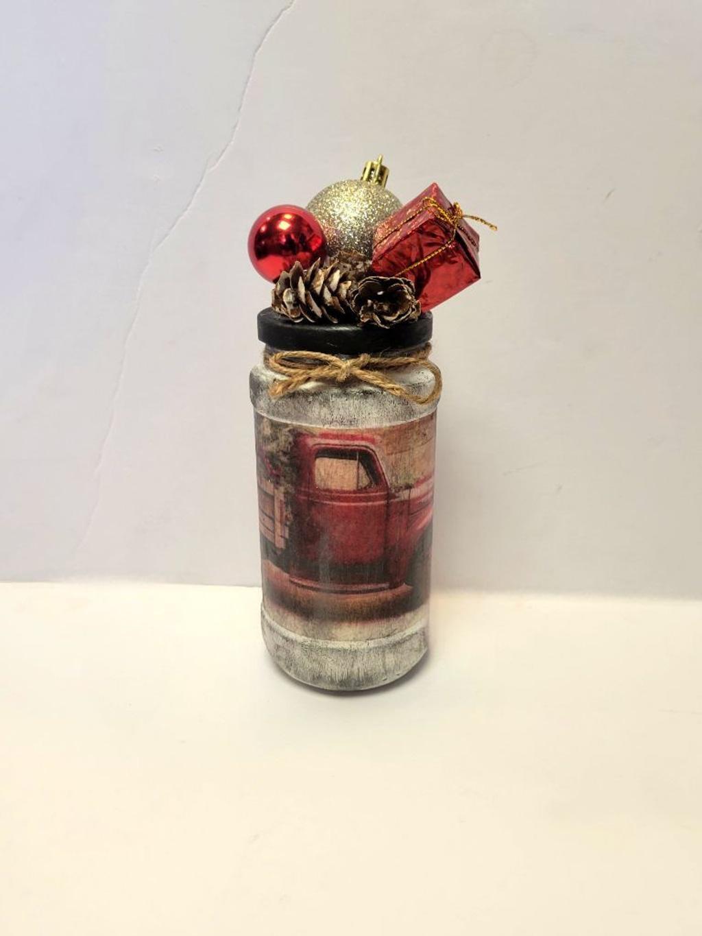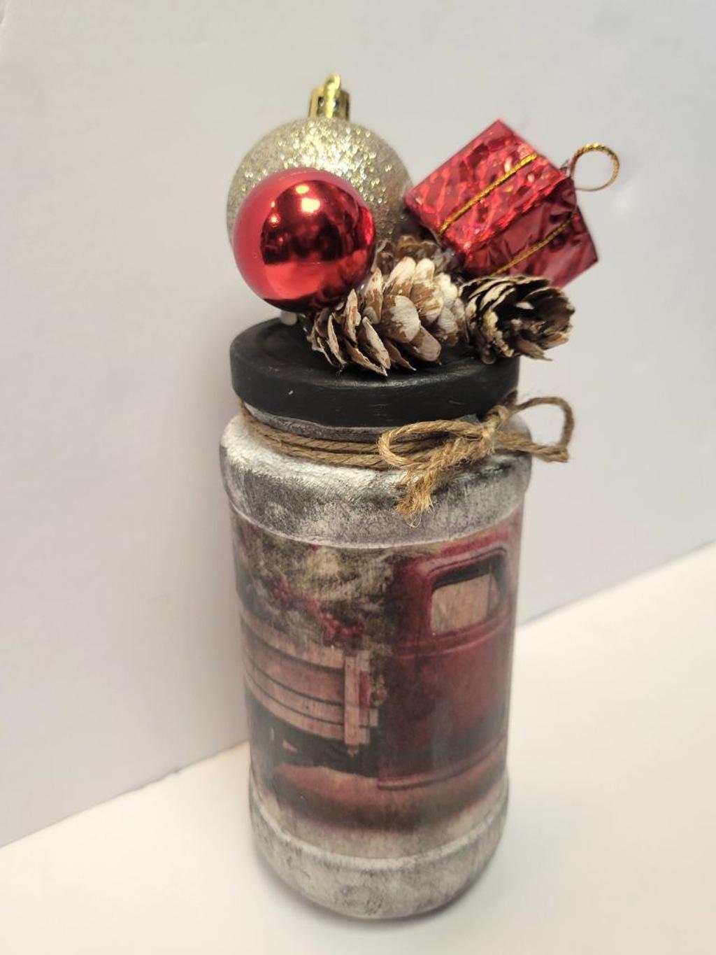 Handmade lidded glass jar that's been distressed and an applique added of the old red rustic farmhouse truck in a Christmas scene, and mini frosted pinecones, presents, and ornaments added, with a twine bow in front. **Truck not included ** #Farmhouse #rustic #farmhousetruck #handmade #christmasdecor