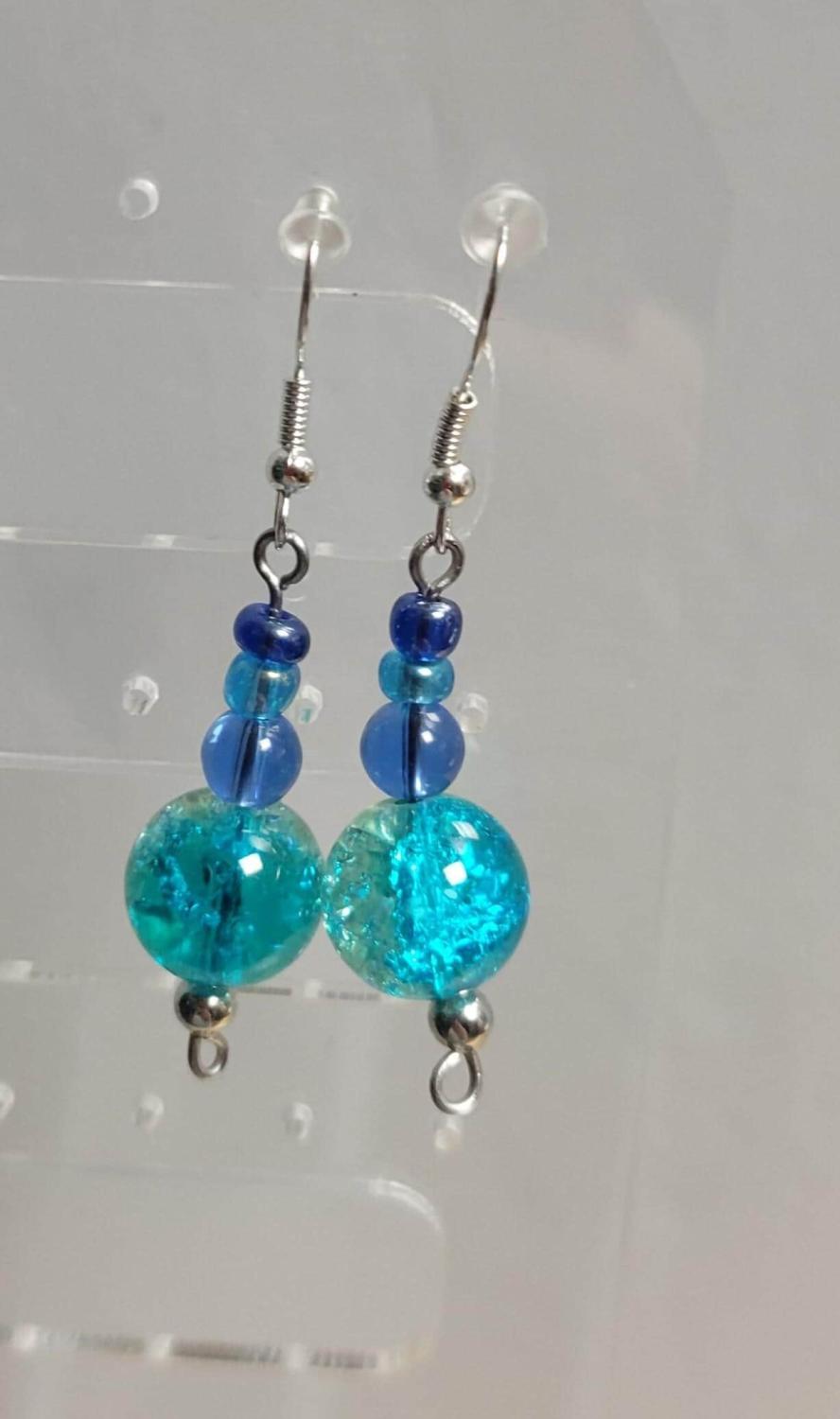 Handmade glass bead hook drop earrings in blues and greens and silver hook, measures approximately 1.5"