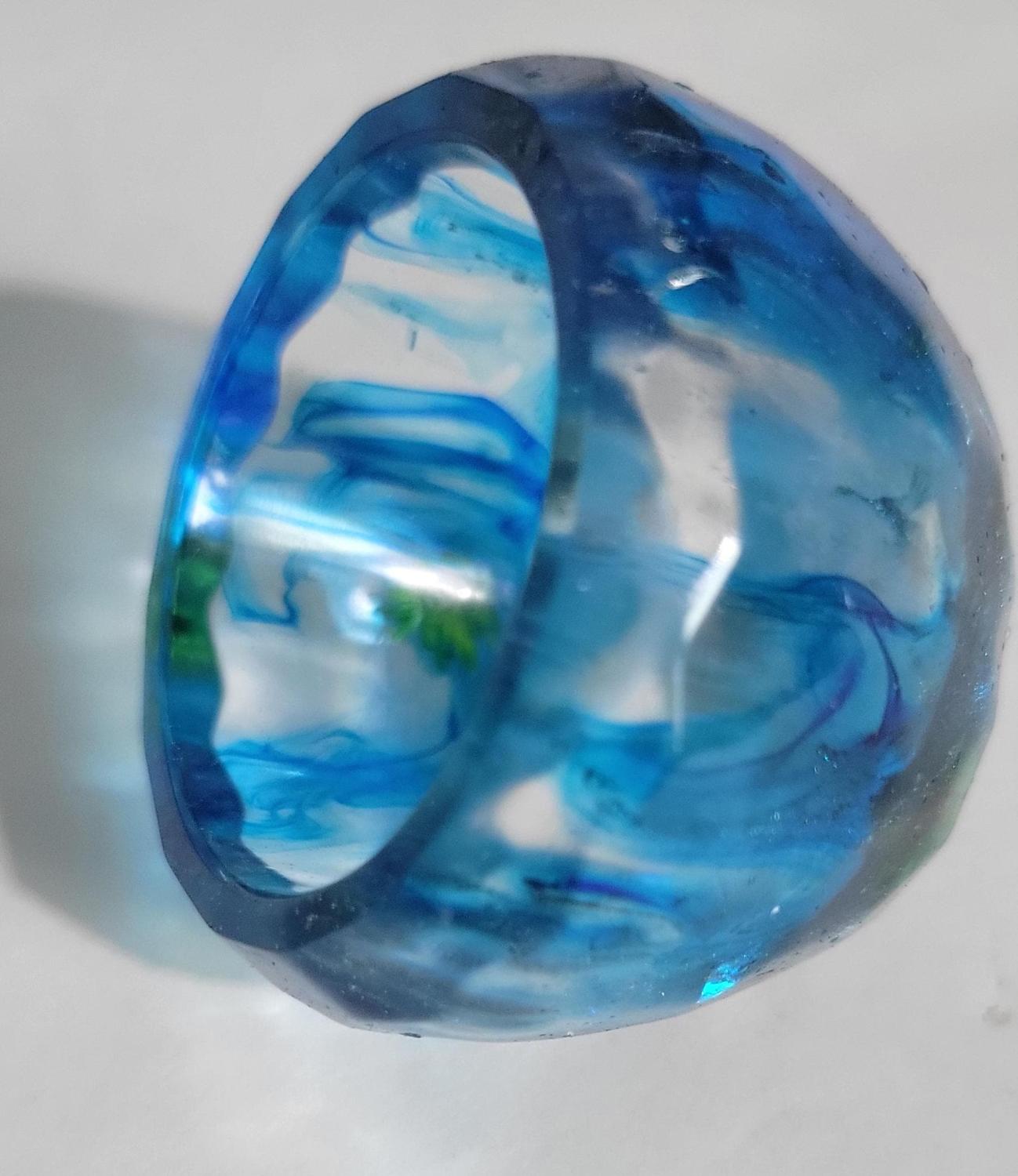 Hand crafted resin planter or led tealight holder, with shots of blue dye and flower embellishments throughout. Measurements are approximately 1.5x1".