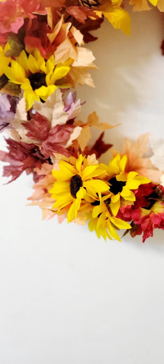 This beautiful autumn wreath is hand crafted and features vibrant sunflowers, pinecones, and colorful leaves. Perfect for holiday decor, this wreath will add a touch of warmth and cheer to your home. The wreath is designed with a festive and seasonal theme, making it a lovely addition to your fall decorations. Measurements are approximately 19" diameter.