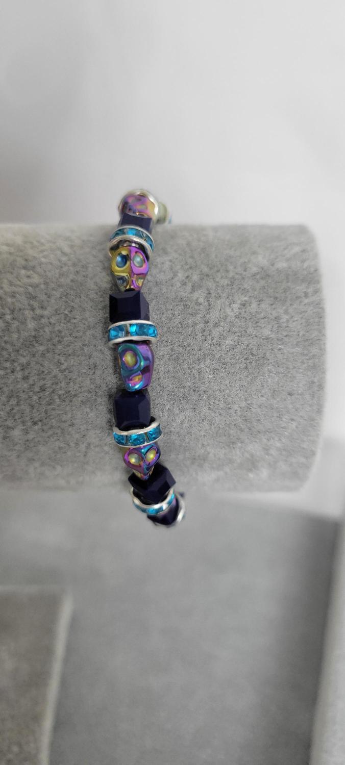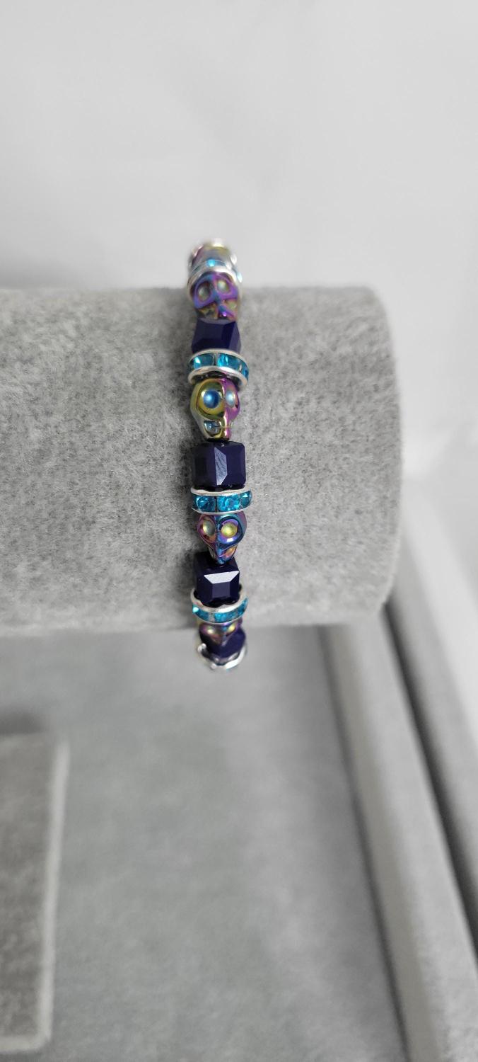 Hand crafted bracelet with iridescent skulls, dark blue glass beads, and blue rhinestone spacers, with a stretchy cord. Measurements are approximately 7".