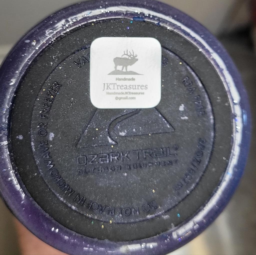 Sparkling hand crafted 30 oz Ozark Trails tumbler with a celestial, nebula design, with "Reach for the stars" on the front. Features a blend of purple, red, and blue hues. Perfect for on-the-go hydration. Measurements are approximately 9" tall by 3.5" wide.