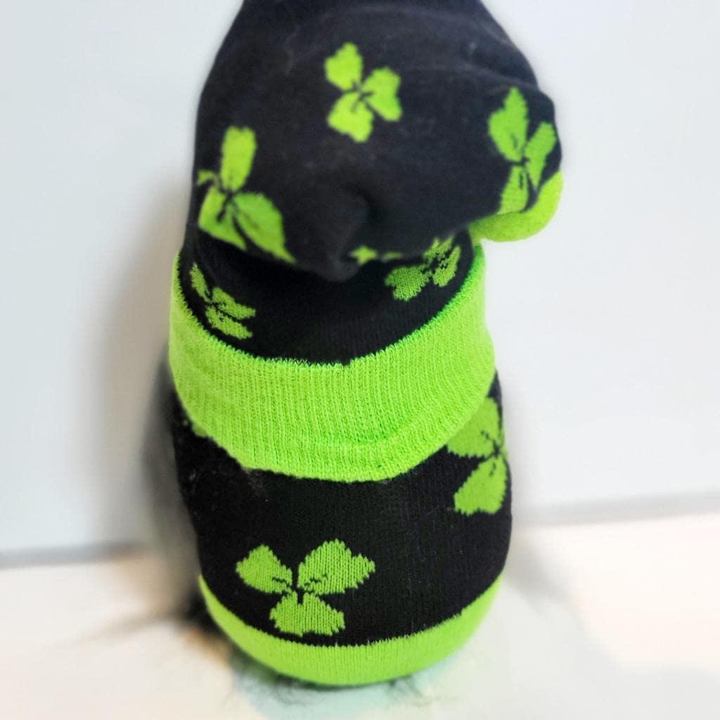 Hand crafted St Patrick's Day Leprechaun gnome made from a black with lucky green 4 leaf clovers, weighted with rice, brown button nose, long, gray, flowing beard, with matching hat, topped off with a green pom pom. He measures approximately 7" tall.
