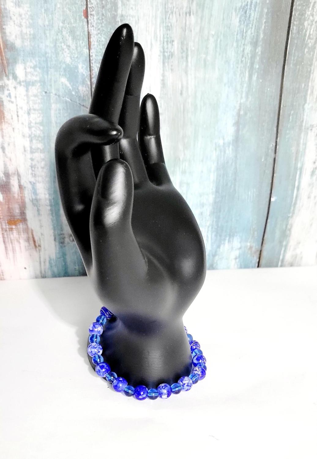 Hand crafted dark blue and white acrylic beads and blue translucent glass beaded bracelet on a blue stretchy cord. Measurements are approximately 8".