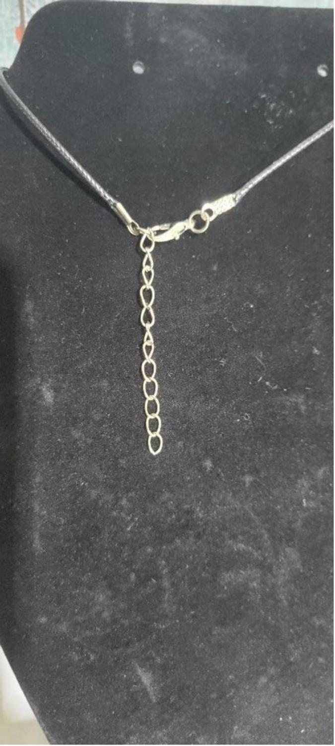 Handmade Christmas themed medallion necklace with a round, green, resin pendant. The pendant is approximately 3/4 inch in diameter and features various Christmas-themed embellishments, including snowflakes, candy canes, and Christmas trees. The pendant is attached to a black, adjustable cord necklace with a silver-toned lobster clasp. The necklace is approximately 14 inches in length.