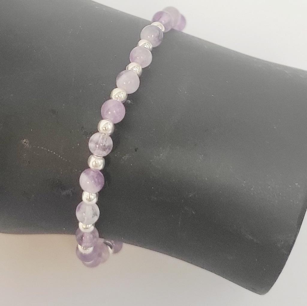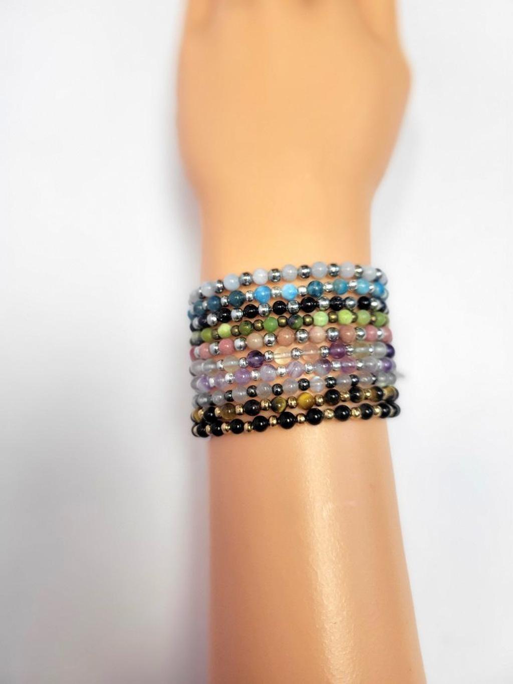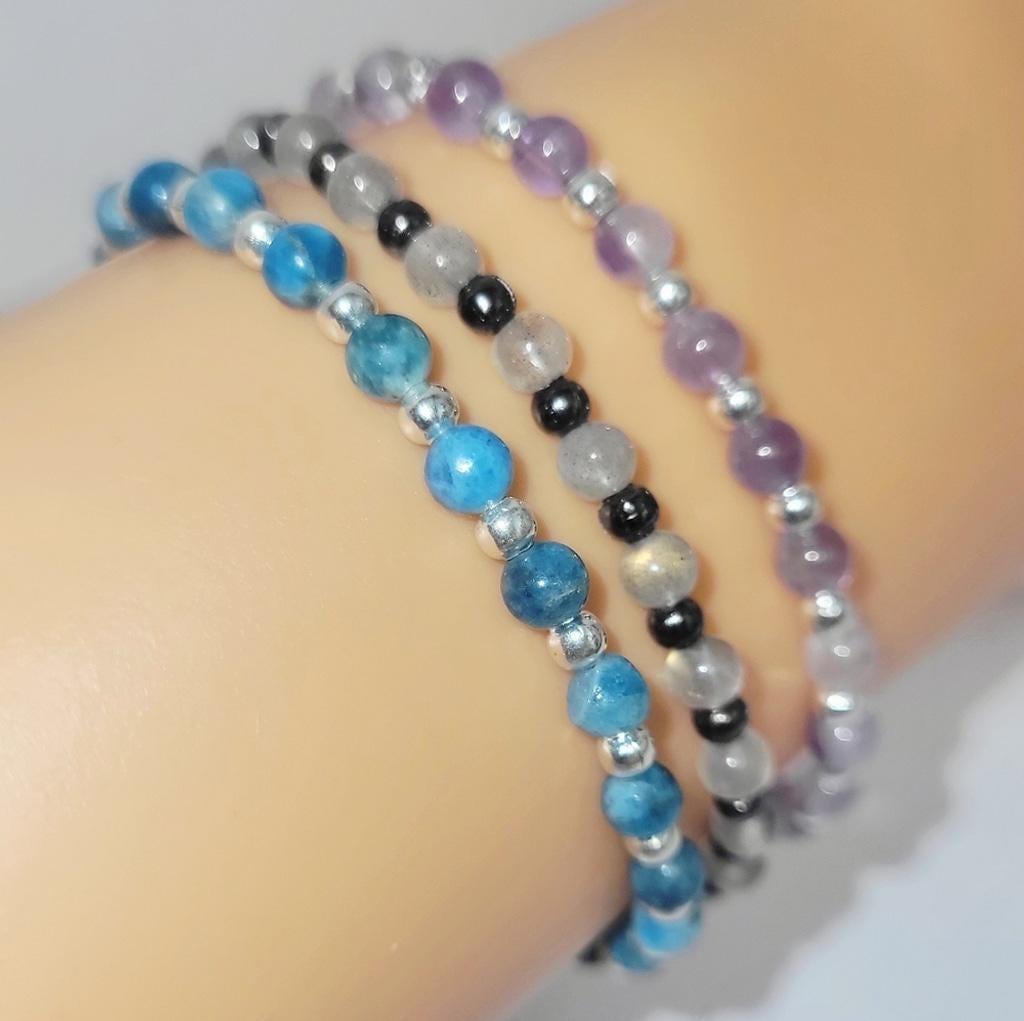 Handmade natural gemstone 4mm dainty beaded bracelets in amethyst, gray moonstone, blue apatite, Tiger's eye, Golden Obsidian, Blue Sandstone, Flourite, Aquamarine, Rhodonite, Austrian Jade, Selenite, Purple Dragon Vein, mixed gemstone. Measurements are approximately between 6.25-7". The bracelets can be bought separately, or buy 2 save $5, buy 3 save $10. Bundle to save. Amethyst protects against negative energy, stress, & bad habits. Helps with anxiety, insomnia, & headaches. Gray moonstone often called the "New Moon Stone", believed to bring about potential, perceive beyond the veil, & work with unseen realms. Blue apatite enhances communication, intuition, & motivation. Blue sandstone associated with love, hope, & commitment. Rhodonite promotes self-love & heals emotional wounds. Aquamarine courage, emotional clarity, & calm Tiger eye courage, strength, grounding Obsidian grounding, protection, energy clearing Australian jade helps emotional healing Flourite promotes mental/emotional clarity, balance, & focus