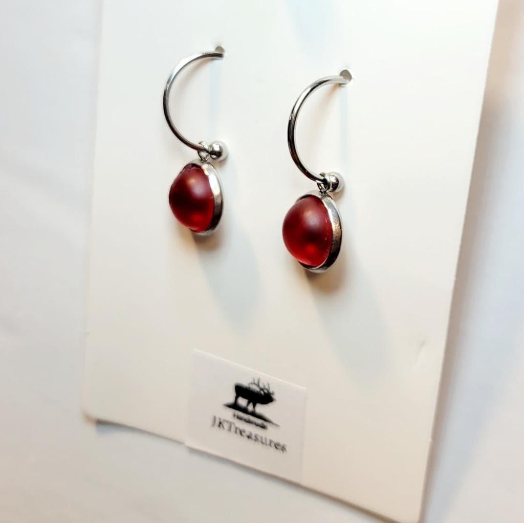 Hand crafted elegant 10 mm red crystal sea glass rhinestone dangle drop hoop earrings set on a stainless steel bezel tray. Perfect for adding a pop of color to any outfit. Check out my other listings for the matching necklace. Discount for bundling both!
