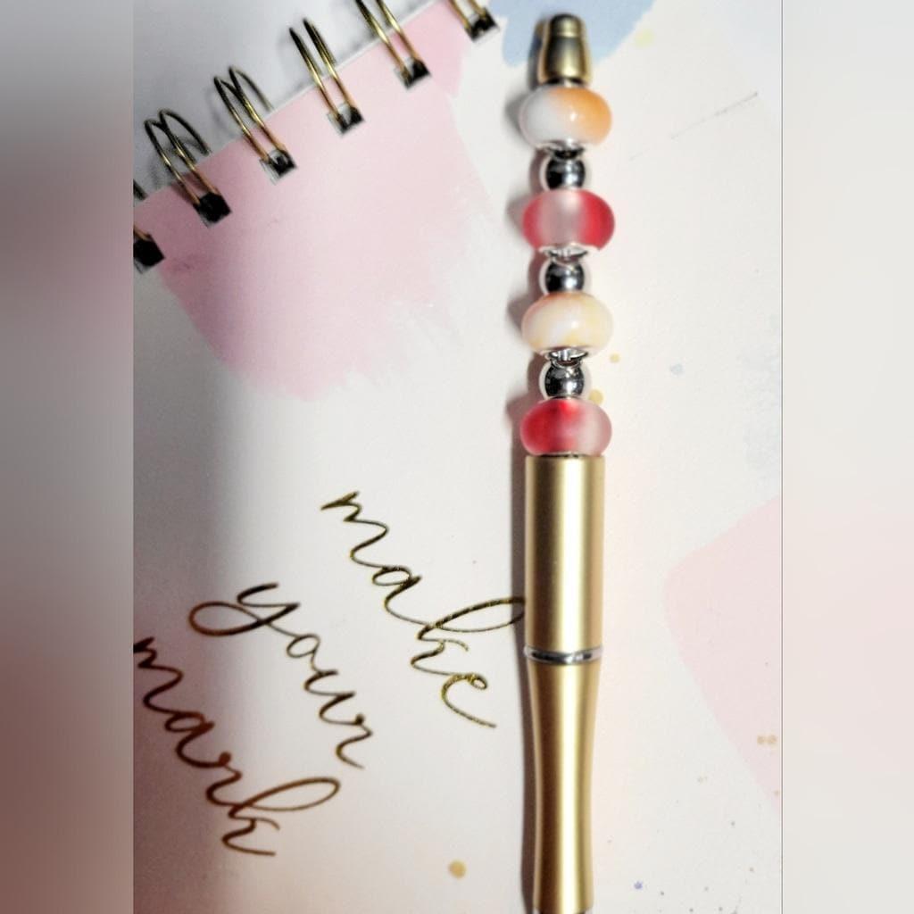 This hand crafted elegant set of 3 beaded pens ate in black, with shades of blue large beads and white rhinestones, white, with green and royal blue beads and white rhinestones, and gold, with red and orange beads and metal spacers. Perfect for adding style to your writing. The ink is black. Notebook not included.