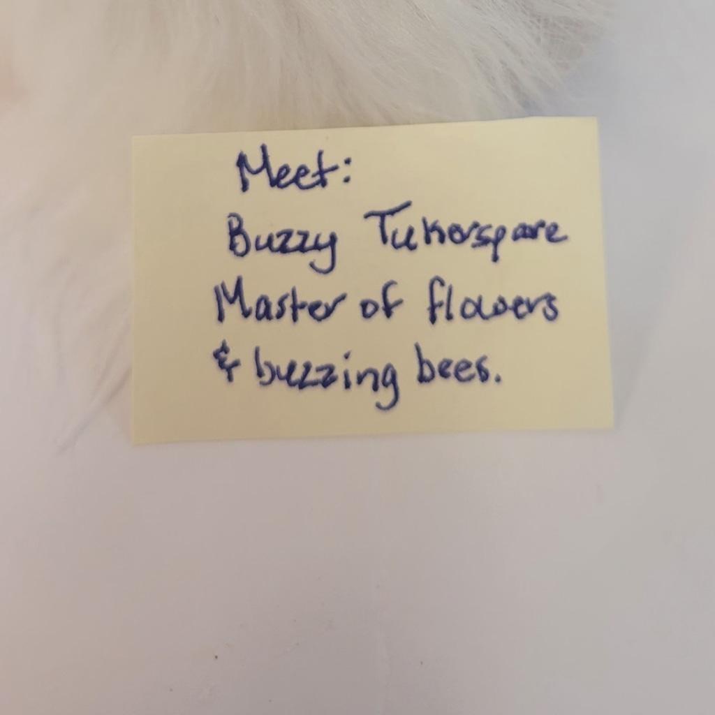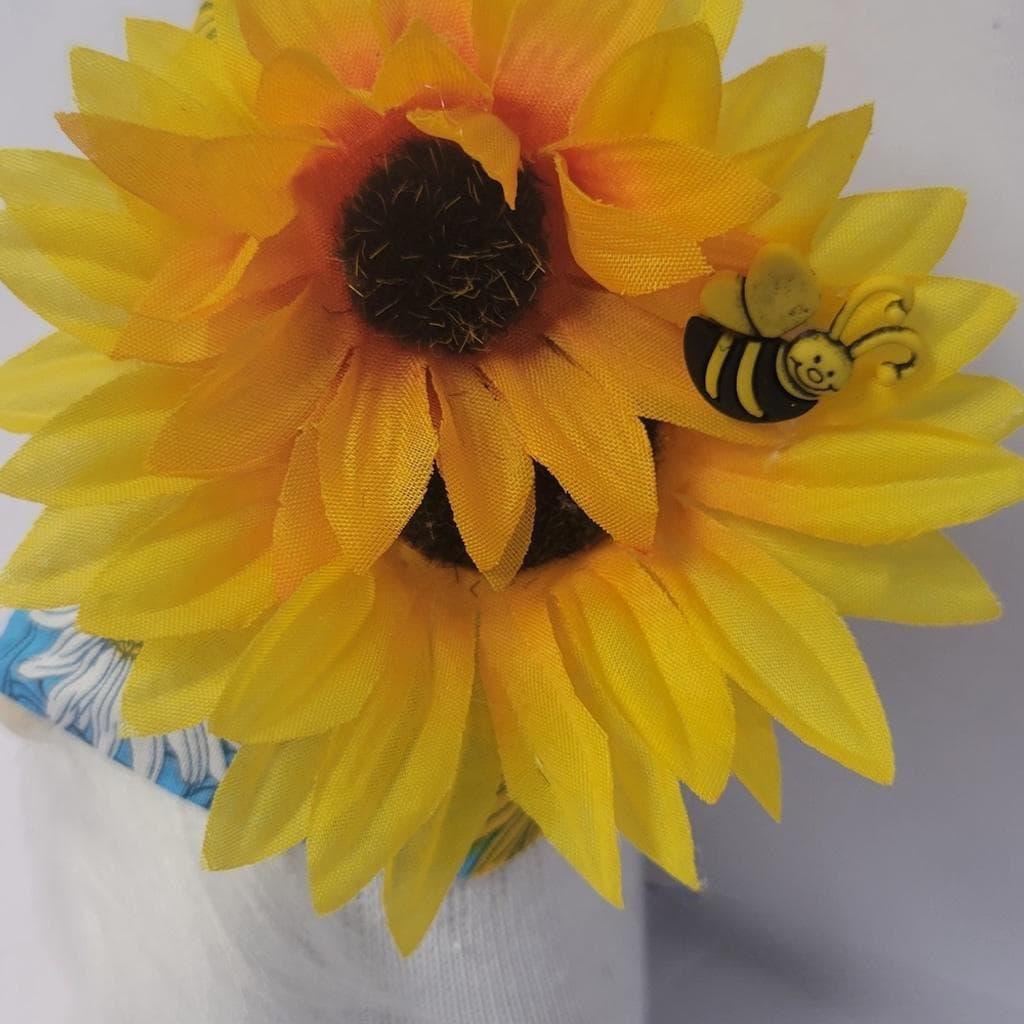 Meet Buzzy Tukerspare, master of flowers, and buzzing bees. Buzzy is handmade with love and made from premium materials. He is weighted with rice and premium poly-fil for stability, has a long white faux fur beard, wooden nose, a bright blue hat with daisy print, and sunflowers with a bumble bee nestled inside. He stands approximately 7" tall and 16" to the tip of his hat. #gnomedecor #sunflower #daisy #homedecor