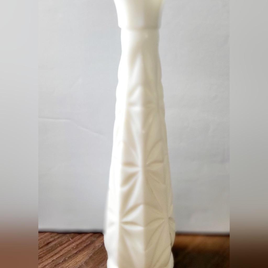 Enhance your home decor with this elegant 9" Hoosier white milk glass bud vase, featuring a starburst pattern. Perfect for adding a touch of sophistication to any room. Flower arrangement not included.