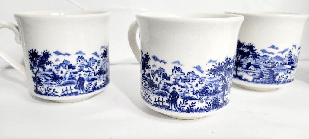 Set of four pre-owned porcelain mugs. Each mug features a blue and white landscape print. They measure approximately 4x3x3 inches. The mugs have a simple, curved handle. Minor imperfections include a small chip on one mug's lip and one handle has been repaired, and a few minor scratches on the surface. The base of each mug is marked 'Made in England'. The overall condition is good, showing signs of previous use due to its age.