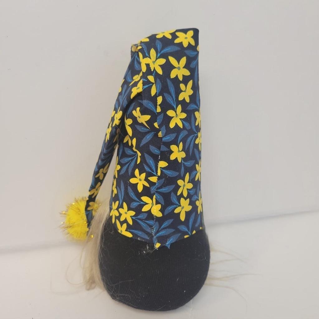 Meet Bloomfizz Daisyleaf, master gardner & flower enthusiast gnome. Bloomfizz is handcrafted with love, made from premium materials. He is weighted with rice and premium poly-fil, has a wooden nose, a long flowing blonde faux fur beard, wearing a long blue and yellow daisy printed hat, with a yellow sparkly pom pom on the tip, and a bumble bee going along for the ride. He stands approximately 8" tall and 16" to the tip of his hat. #gnomedecor #Bumblebee #daisygnome #sunflowergnome